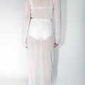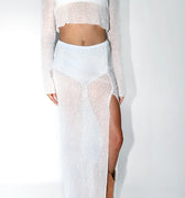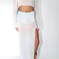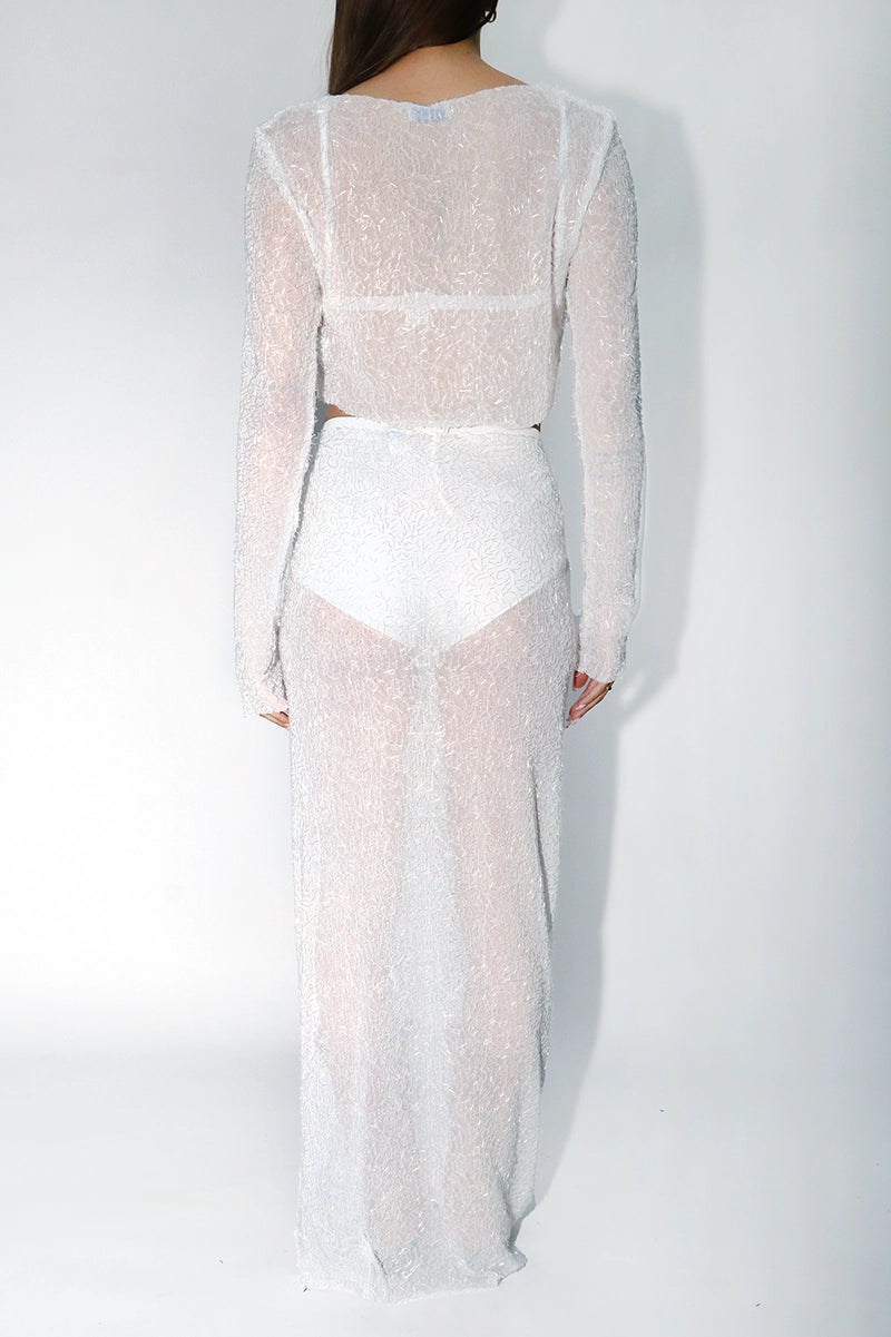 Pollera Aran off white larga con tajo centrado en pierna izquierda de mesh con canutillos a tono, translucido. Largo modular hasta talones, fit regular. Tela de peso liviano. Avio marcario chapita de metal sofia en cintura delantera lado izquierdo.