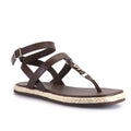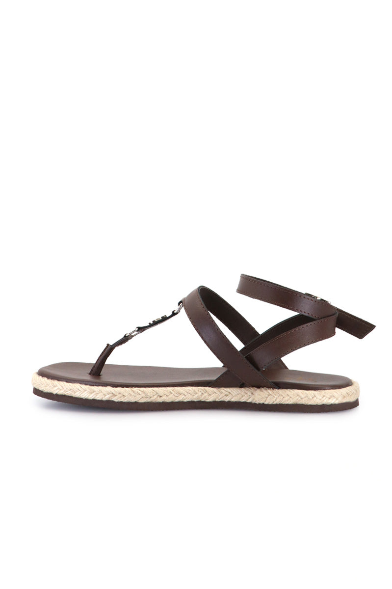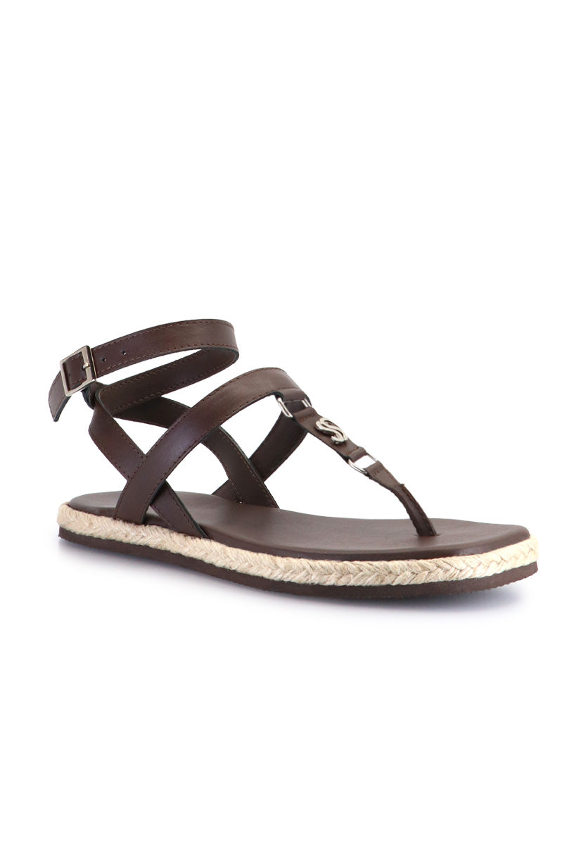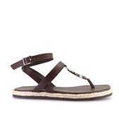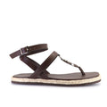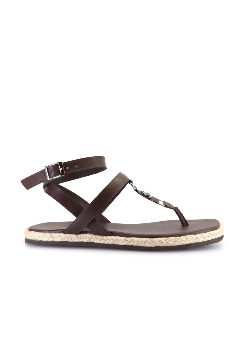 Sandalia Yavi chocolate de fibras animal frienly. Ojota con pasador en tira de empeine y logo SS. Pulsera con hebilla. Plantilla forrada. Base de eva forrada en yute. Altura de 1,5 cm.