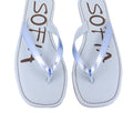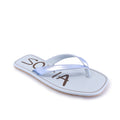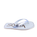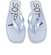 Ojota celeste de cuero metalizado, con forrerias animal Friendly. Estampa SOFIA exclusivo de nuestra capsula CELEB. Costuras combinadas en capellada y plantilla a contra tono. Suelín de goma.
