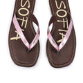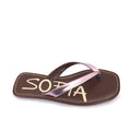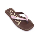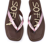 Ojota rosa de cuero metalizado, con forrerias animal Friendly. Estampa SOFIA exclusivo de nuestra cápsula CELEB. Costuras combinadas en capellada y plantilla a contra tono. Suelín de goma.