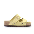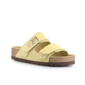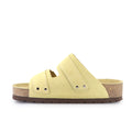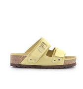 Sandalia Sofa amarillo tipo birk al corte, en gamuzón. Tira de velcro bordada a 2 colores en empeine. Plantilla anatómica y suelin de goma eva.