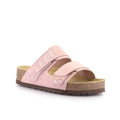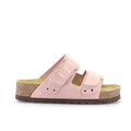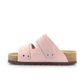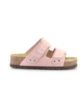 Sandalia Sofa rosa tipo birk al corte, en gamuzón. Tira de velcro bordada a 2 colores en empeine. Plantilla anatómica y suelin de goma eva.