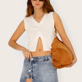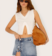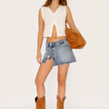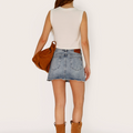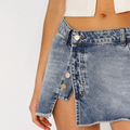 Pollera Wim celeste confeccionada en denim 100% algodón de peso medio. Su diseño presenta tiro irregular con caída en pico en el lateral delantero y cartera con botones jeaneros para el acceso. El ruedo al corte aporta un acabado descontracturado. Con largo modular por debajo de la cola, es una prenda ideal para sumar a tus looks de verano.