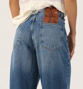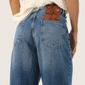 Jean Rous azul confeccionado en denim 100% algodón con pierna recta. Presenta pinzas en ruedo y rodillas, además de ruedo al corte que aporta un acabado descontracturado. Incluye avíos marcarios en color níquel y badana de cuero larga en color suela. De tiro medio y largo modular por encima de los tobillos, es un básico actual y versátil para distintos looks.