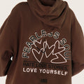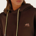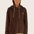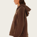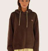Hoodie Zaro marrón de calce oversized confeccionado en rústico de algodón de peso medio. Su diseño incorpora bolsillo canguro y doble cordón de ajuste con terminales personalizadas y arandelas niqueladas a tono. En la espalda se destaca un bordado exclusivo. Su largo modular queda por debajo de la cadera, aportando comodidad y estilo urbano.