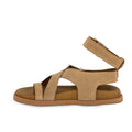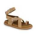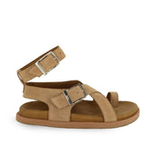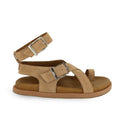 Sandalia Taly color arena de cuero con hebillas en caña y pulsera. Logo en tira de empeine. Forrería de cuero vacuno. Plantilla anatómica y fondo inyectado.