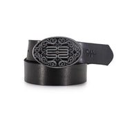 Cinturón Coun negro de cuero con hebilla ovalada tipo " cowboy" personalizada con logo nuevo de la marca.
