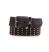 Cinturón de cuero gamuzado color tostado con tachas chiquitas bombe color niquel en todo el cinturón. Hebilla niquel personalizada con logo sofia grabado.