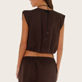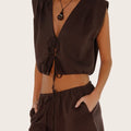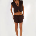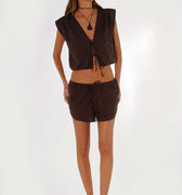 Short Ban color chocolate confeccionado en lino liviano y suave al tacto, con cintura ajustable mediante lazos en tela base. Su largo modular cae por debajo de la cola, ofreciendo un look relajado y fresco.
