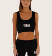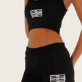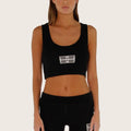 Top Tur negro tipo deportivo corto hecho en viscosa con jacquard. Con puño en cintura doble con elástico y logo en jacquard a contratono en la delantera. Tejido de peso medio con largo modular por debajo del busto. Perfecto para un estilo deportivo urbano.