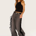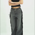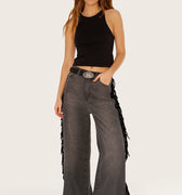 Pantalón jean Mef negro 100% algodón, con tiro medio y pierna amplia para un fit cómodo y moderno. Detalles de avíos negros y flecos gamuzados a tono en los laterales, que aportan un toque distintivo. Peso medio y largo hasta los talones, ideal para un estilo versátil y urbano.