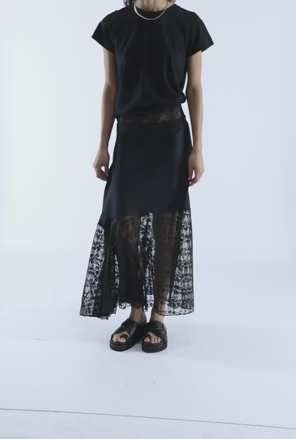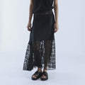 Pollera larga Kulm negra combinada con encaje y satén en delantero y espalda. Su diseño alterna piezas de encaje translúcidas con paneles de satén opacos, generando contraste y textura. Presenta cintura con elástico para un calce cómodo y vuelo en el ruedo que aporta soltura y movimiento. Ambos textiles son livianos y el largo modular queda por debajo de los tobillos.