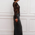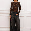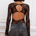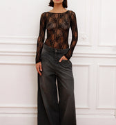 Body Encia clásico de encaje translucido negro, con cuello bote y manga larga. Espalda descubierta. Fit anatómico. Chapita de metal sofia en espalda.