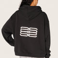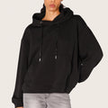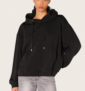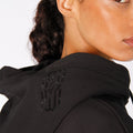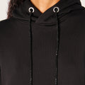 Hoodie Roza color negro oversized confeccionado en rústico de algodón de peso medio. Su diseño incorpora bolsillo canguro, cordón de ajuste con strass, terminales personalizadas y arandelas niqueladas a tono. También tiene la tirilla de limpieza del cuello de espalda del lado interno estampada con logos de marca, mientras que en la espalda se destaca un parche exclusivo con el logo realizado en strass. Su largo modular queda por debajo de la cadera, ofreciendo un calce cómodo y actual. Una prenda con detalles que elevan cualquier look.