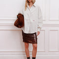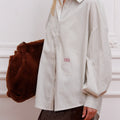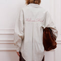 Camisa Fenn color pistacho confeccionada en poplín rayado, con fusión de rayas ubicadas en horizontal y vertical que aportan dinamismo al diseño. Fit oversize y largo por segunda cadera que generan un calce relajado y actual. Incluye botones personalizados Sofía, etiqueta grande de marca y bordado a tono como detalles distintivos. Una camisa protagonista que suma carácter y estilo al look.