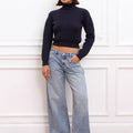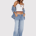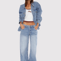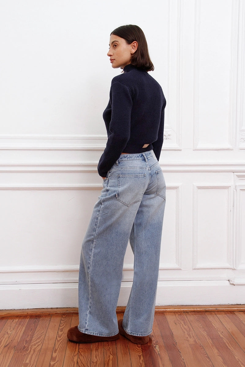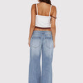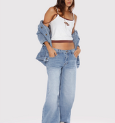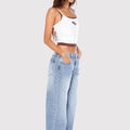 Jean Kip color celeste confeccionado en denim rígido. Diseño Wide le fit, tiro bajo y extra largo. Presenta avíos marcarios personalizados: badana de plástico, grifa tejida, botón y remaches niquel. Un ítem para combinar con tops, sweaters o camperas.