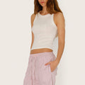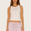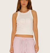 Musculosa Lior blanco confeccionada en morley elastizado con collareta a tono de 2 cm en cuello y sisas. Presenta el logo de la marca en la delantera, realizado con técnica de tela atrapada como detalle distintivo. Su textil es liviano y se adapta a la silueta del cuerpo, con largo modular por encima de la cadera.