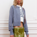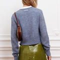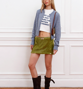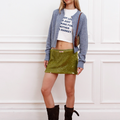 Pollera mini Pola color verde confeccionada en lentejuelas elastizada, que aportan brillo y movimiento. Su diseño incorpora detalle de cintura tipo “bombacha” que define la silueta. Fit anatómico y largo por debajo de la cola. Incluye etiqueta tejida centrada en la cintura delantera como detalle distintivo.