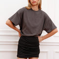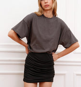 Pollera Trow negra confeccionada en lycra suave y liviana al tacto. Su diseño presenta frunce lateral. El largo modular queda por debajo de la cola, logrando una silueta moderna y adaptable.