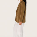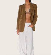 Saco Sam verde oversized con cruce militar y botones personalizados a tono. Su diseño aporta volumen y presencia, mientras que el largo modular llega hasta la segunda cadera, asegurando un calce cómodo y actual. Una pieza de sastrería moderna que suma carácter a cualquier look.