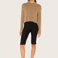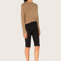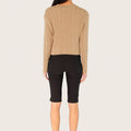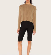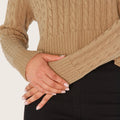 Sweater Joy camel tejido en ochos y cuello redondo, con un tacto suave y un peso liviano. Su largo modular es por debajo de la cintura.