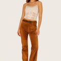 Pantalón flare Flak marrón de gamuza, con botón con cartera con cierre para acceso a la prenda. Tiene bolsillos en la delantera y trasera . Su tiro es medio y el peso de su textil también es medio . Para un calce de tiro bajo, se recomienda elegir un talle más.