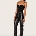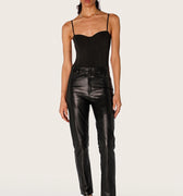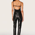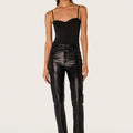 Pantalón Lita negro 5 bolsillos de cuero, pierna recta. La cintura presenta pasadores, cierre y botón jeanero. Su largo modular es hasta tobillos.