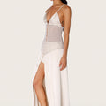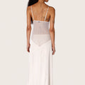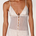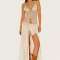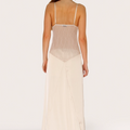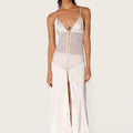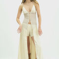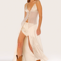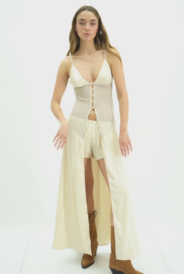 Top largo Nuna crudo de seda y encaje. Presenta escote con tazas triangulito, cartera con botones forrados y breteles regulables. Falda con vuelo y tajo central. Tela liviana y suave. Largo hasta los talones, perfecto para ocasiones especiales.