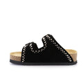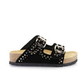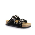 Sandalia Roker negra tipo birk de cuero con tachas bombé en 2 medidas. Hebilla con sofia grabado. Forreria textil. Plantilla anatómica, con suelin de goma eva.