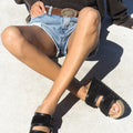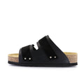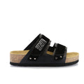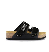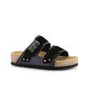 Sandalia Sofa negra tipo birk al corte, combinada en cuero y gamuzón. Tira de velcro bordada a 2 colores en empeine. Plantilla anatómica y suelin de goma eva.
