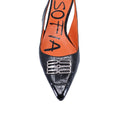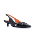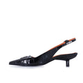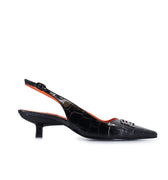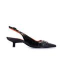 Stiletto Celeb negro de cuero croco con herraje en capellada. Presenta el forro y taco pintados combinados, a contratono del corte. Con una altura de taco de 3,5 cm. Suelin de cuero flex. Plantilla estampada con el diseño SOFIA a tono con el corte.