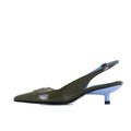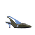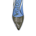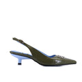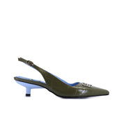 Stiletto Celeb verde de cuero croco con herraje en capellada. Presenta el forro y taco pintados combinados, a contratono del corte. Con una altura de taco de 3,5 cm. Suelin de cuero flex. Plantilla estampada con el diseño SOFIA a tono con el corte.