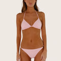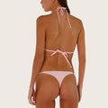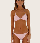 Bikini Gruz rosa, con corpiño triangulito fijo y colaless fija. La bombacha lleva el logo de la marca en color níquel en el lateral izquierdo y costuras al tono de la base. Ideal para acompañarte esta temporada.