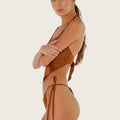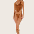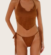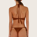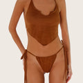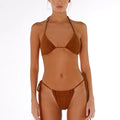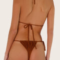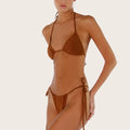 Bikini set de tres piezas Hadi chocolate, en tela de vauquita color suela. Presenta corpiño tipo top con elástico interno en el bajo busto y forrería. Exterior con ruedo irregular en V y ajuste para atar en el cuello. Corpiño movible y colaless para atar y ajustar. La colaless cuenta con frunces en delantero y espalda para un calce favorecedor. Su tela es liviana y suave al tacto.