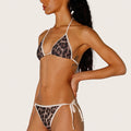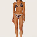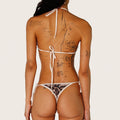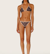 Bikini Nima en tricot mate estampada, liviana y suave para mayor confort. Corpiño y colaless con tiras para atar y ajustar como más te guste. Lleva una chapita metálica con Sofía, un detalle que realza el diseño. Perfecta para acompañarte en los días de verano.