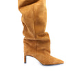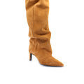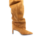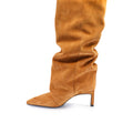Bota Liri suela confeccionada en gamuzón con caña alta arrugada y solapa volcada que aporta textura al diseño. Presenta taco recto forrado en el mismo material que el corte, con una altura de taco 8 cm. Incluye suelín de goma chilena. La caña mide 44 cm de alto, logrando una silueta alargada.