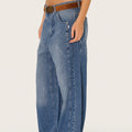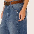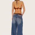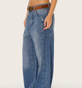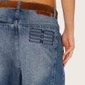 Jean de denim Zarr azul 100% algodón, confeccionado en tejido de rigidez media. Su tiro es medio y el largo modular llega hasta los talones. Presenta un diseño no convencional con recorte superpuesto en delantera y espalda, sin canesú, y bolsillos traseros que continúan el recorte de la pierna. Lleva un bordado grande a tono en la parte trasera y una grifa tejida de marca, aportando un detalle distintivo. Ofrece una silueta moderna y diferente.