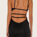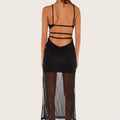 Vestido Yanz negro de encaje translúcido con forrería oscura desde el busto hasta por debajo de la cola. Presenta escote en V y tres cinturones decorativos en el bajo busto que aportan un detalle distintivo. Su espalda baja llega hasta por encima de la cola y cuenta con tajos laterales hasta la rodilla que suman movimiento. Confeccionado en un textil suave y liviano, su largo modular es hasta los tobillos. Un ítem pensado para sumar estilo en cualquier ocasión.