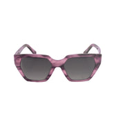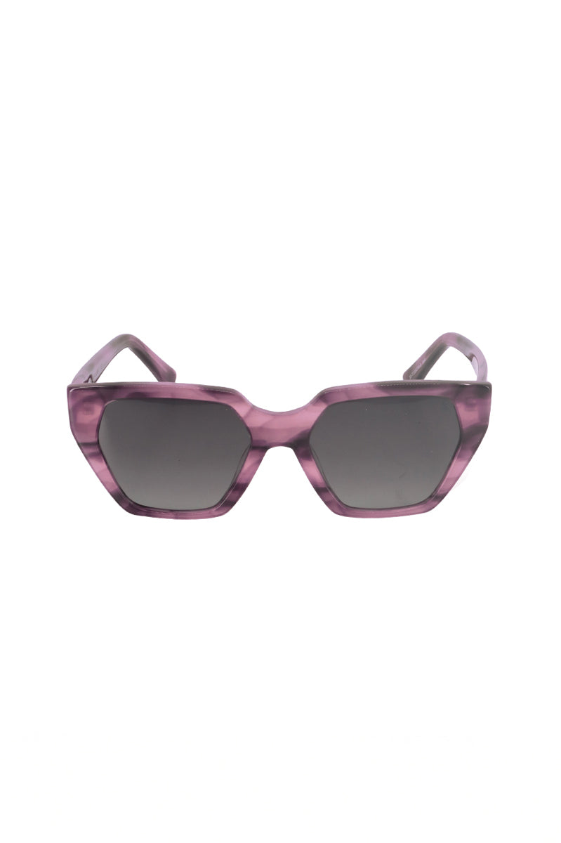 Anteojo de sol de marco geométrico en acetato brillante con color veteado y marca Sofia en metal en patilla, lente tipo aro entero.