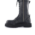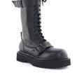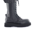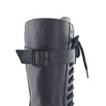 Borcego Cial negro caña alta de cuero negro con cordones y dos tiras con hebilla en baño negro. En la tira del empeine, el logo grabado a fuego. Cierre lateral interno de acceso. Forrería de fibras animal friendly. Fondo inyectado negro de 4 cm de altura. Altura de caña de 30 cm.