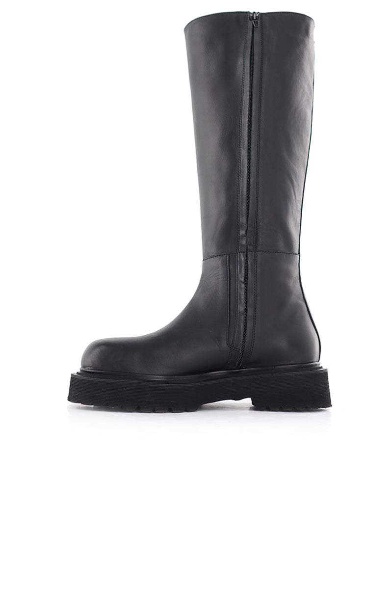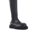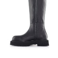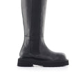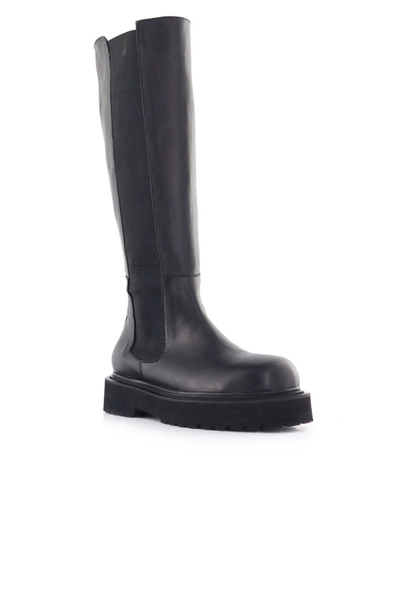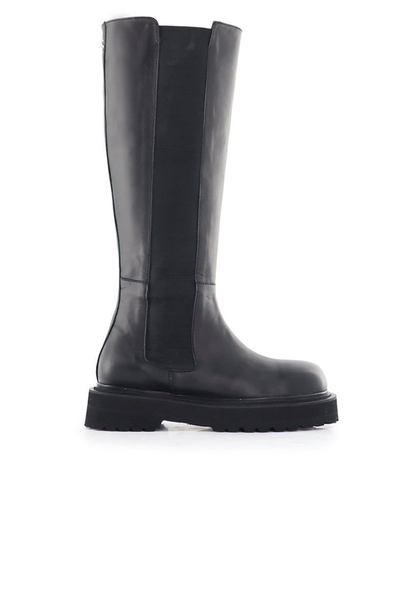 Bota chelsea Seal negra caña alta de cuero negro con elástico y cierre interno de acceso. Aplique marcario en color níquel. Forrería de fibras animal friendly. Fondo inyectado negro altura 4 cm. Altura de caña 41 cm.