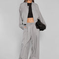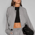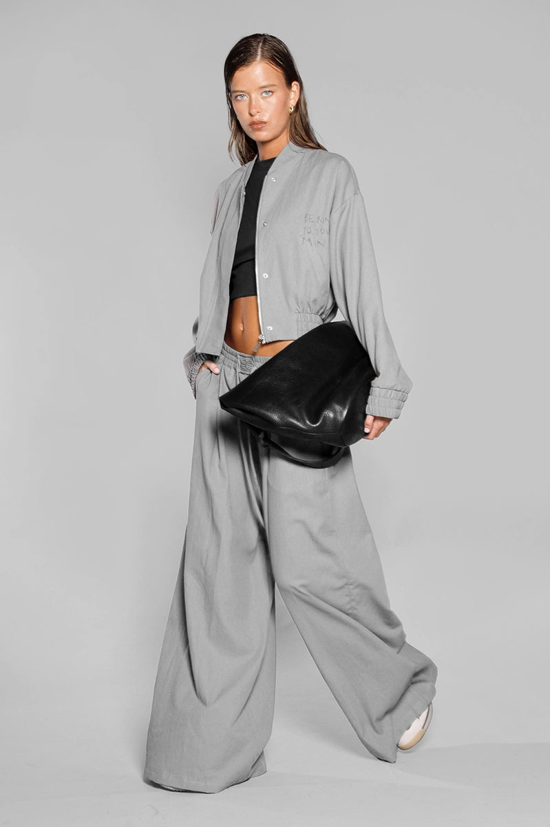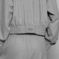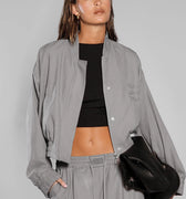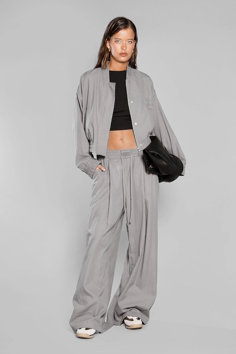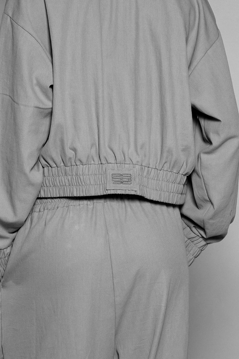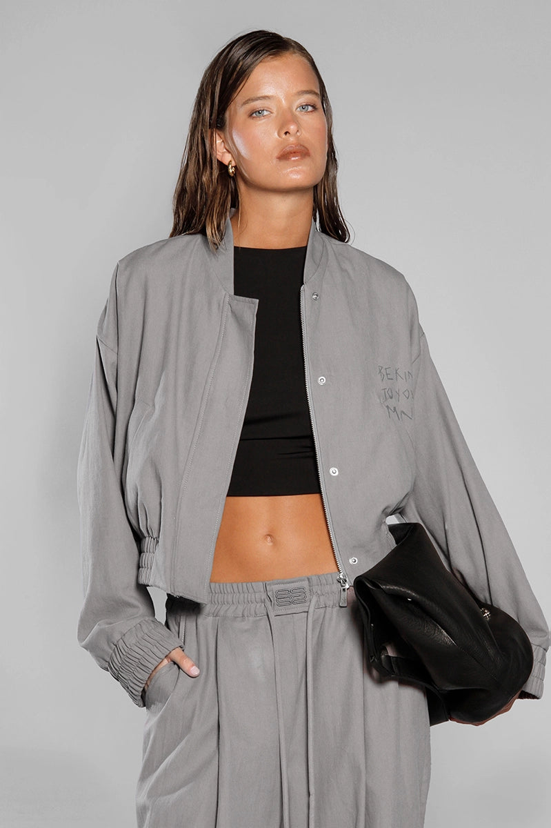 Campera Ewe gris bomber crop de algodón rígido. Con una estampa frontal y un logo bordado en la espalda, esta bomber combina originalidad y calidad para realzar tu estilo en cualquier ocasión.