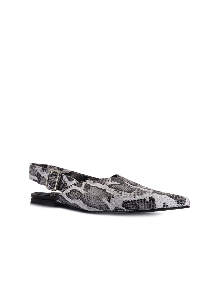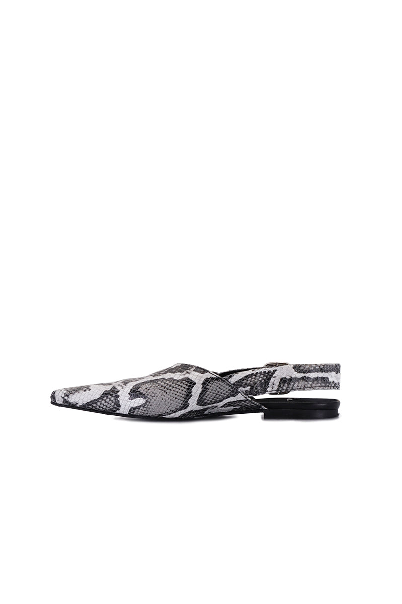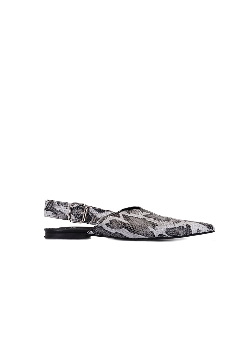 Slipper Atta de snake en punta. Cuenta con una tira forrada con elástico y hebilla en el talón, además de forrería de fibras animal friendly y suelín de goma para mayor comodidad.