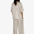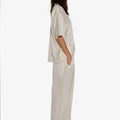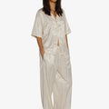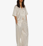 Pantalón amplio con tela sedosa y con brillo, estampada diseño monogram. Cintura con elástico. Su largo modular es hasta talones.