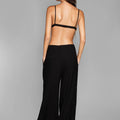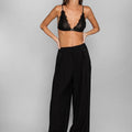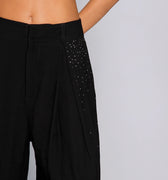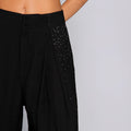 Pantalón sastrero Tulix negro amplio con pinzas y tiro medio. Diseño sofisticado con cierre frontal, ganchito sastrero y detalle de hotfix en los laterales. Para un calce tiro bajo, se recomienda elegir un talle más. Ideal para un look elegante y moderno.