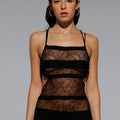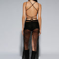 Vestido largo Aura negro de encaje con breteles finos, espalda descubierta cruzada y ajustable. Culotte incluido.