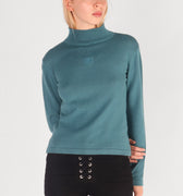 Sweater tejido con cuello media polera. Fit al cuerpo. Logo bordado en delantera.