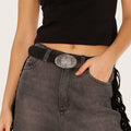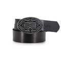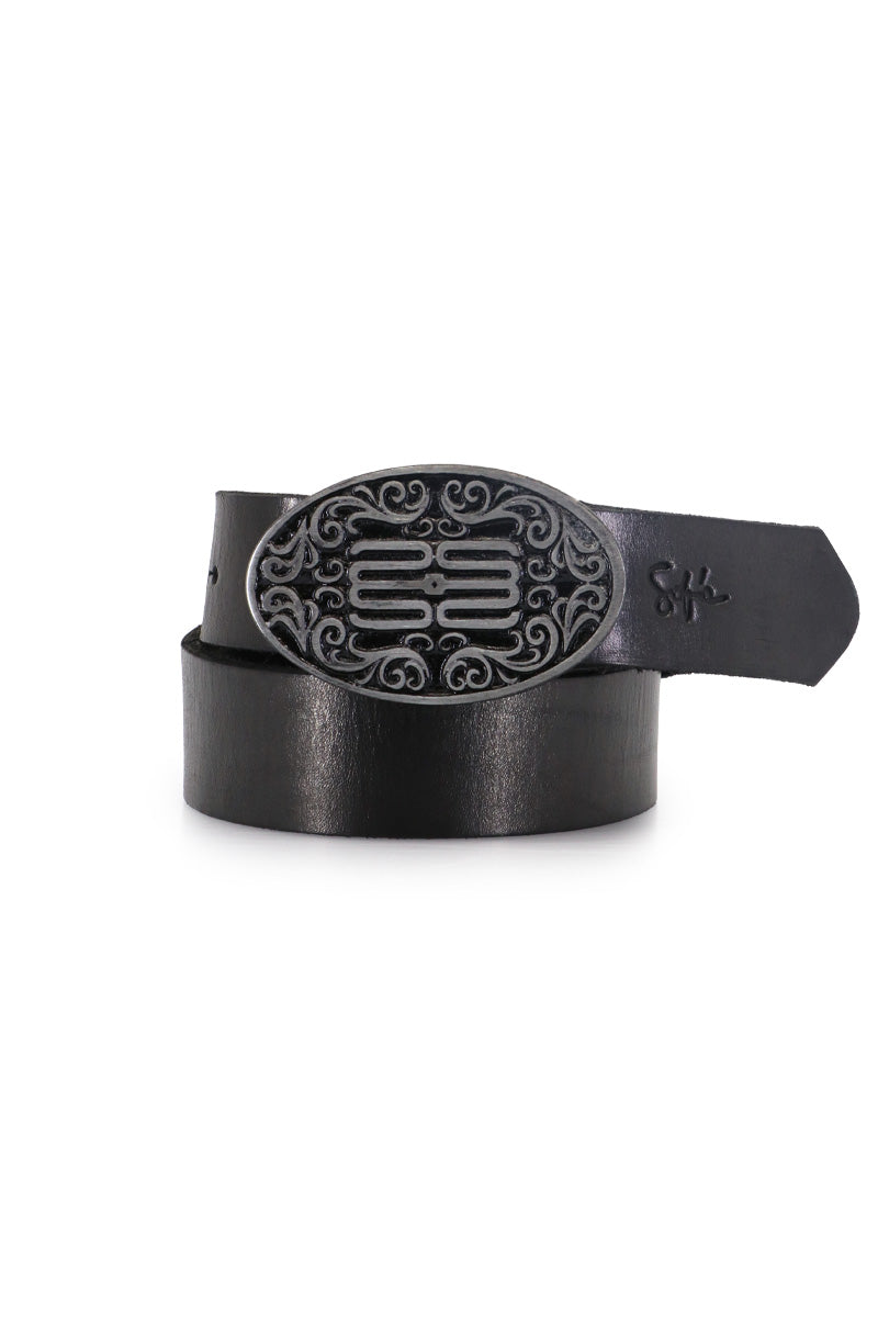 Cinturón Coun negro de cuero con hebilla ovalada tipo " cowboy" personalizada con logo nuevo de la marca.