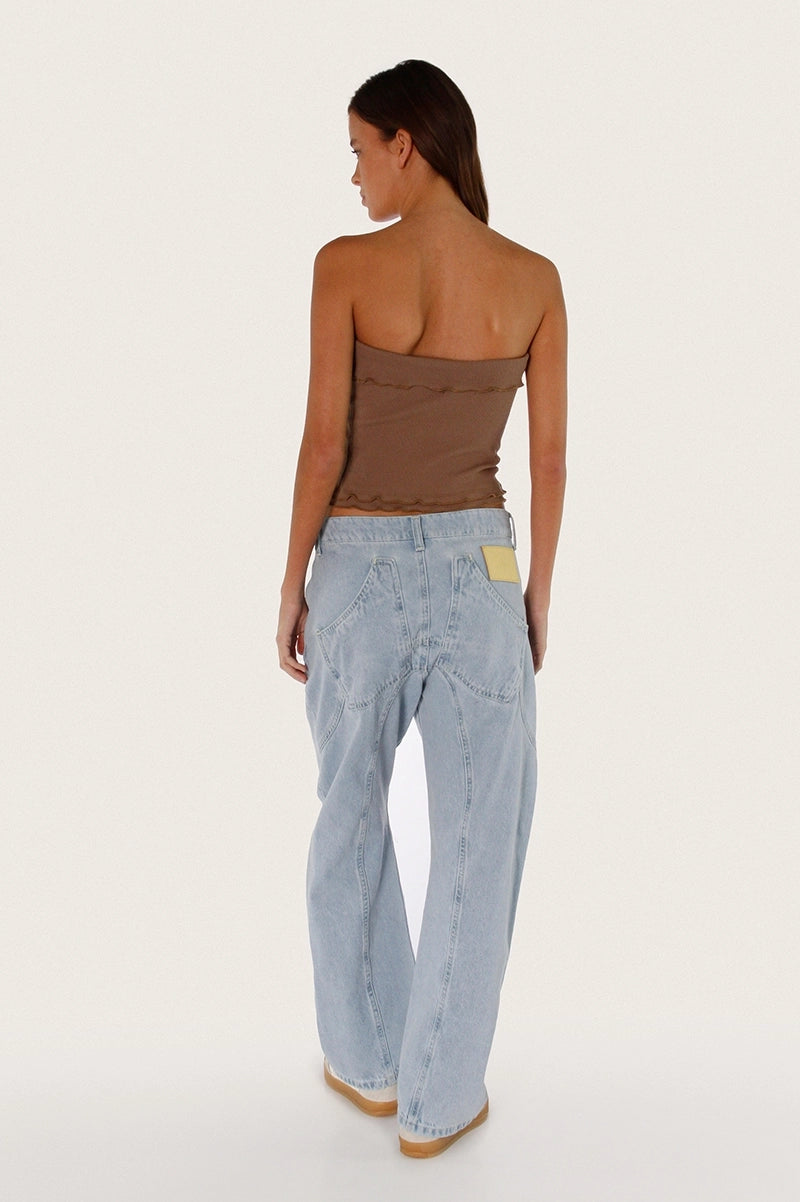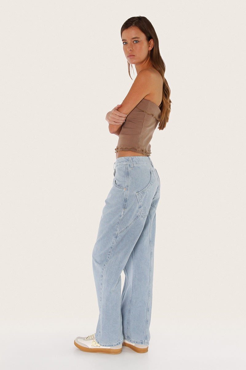 Jean Lich celeste confeccionado en denim 100% algodón con cintura martillo y corte recto. Su diseño incluye recortes curvos con costuras jeaneras que recorren todo el delantero y la espalda, con hilos al tono. El largo modular llega hasta los talones, convirtiéndolo en un ítem distintivo dentro de la colección.
