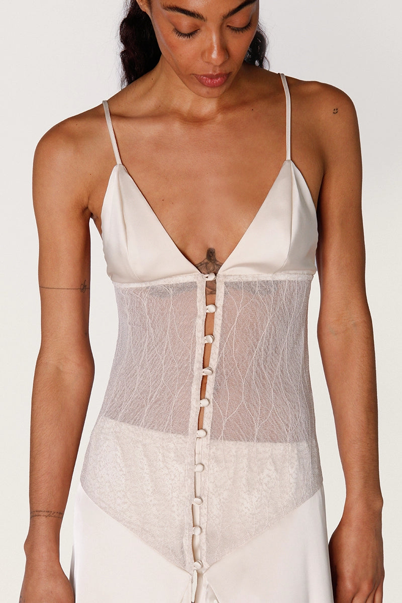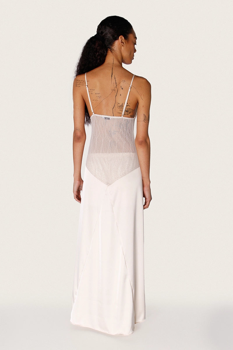 Top largo Nuna crudo de seda y encaje. Presenta escote con tazas triangulito, cartera con botones forrados y breteles regulables. Falda con vuelo y tajo central. Tela liviana y suave. Largo hasta los talones, perfecto para ocasiones especiales.
